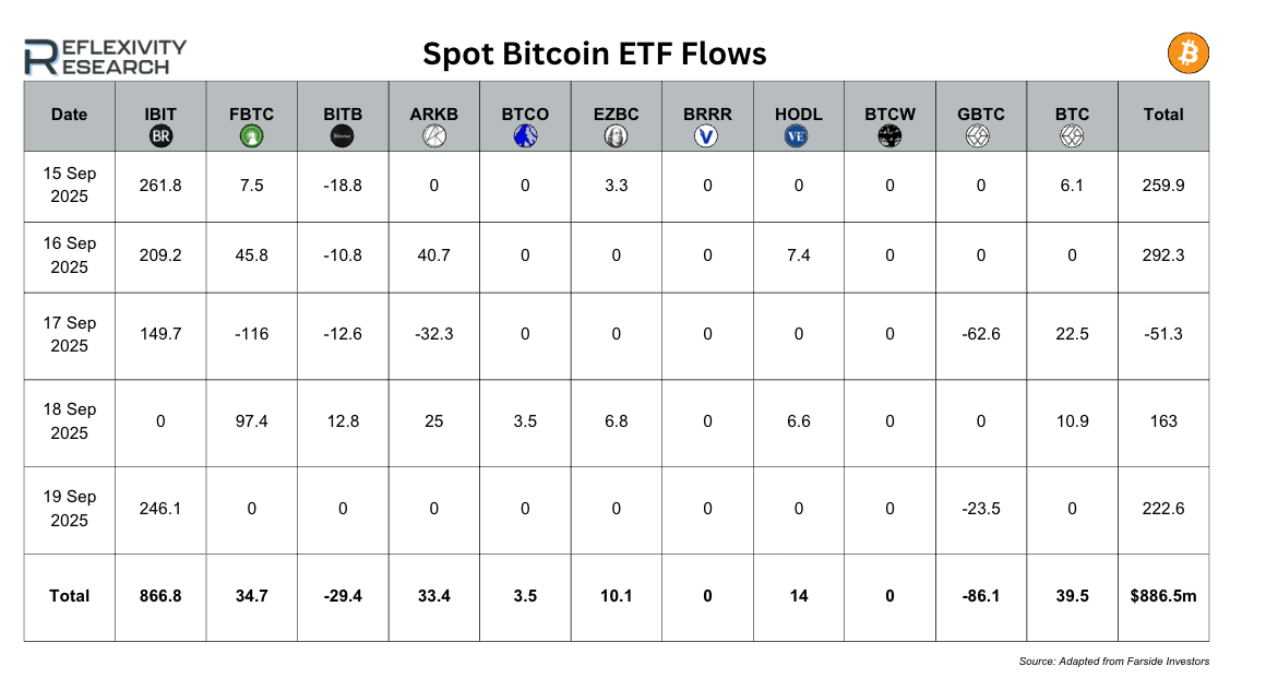 Bitcoin ETFs (15–19 Sep 2025, $ millions): Net +886.5. Four of five sessions were positive (Mon +259.9, Tue +292.3, Thu +163.0, Fri +222.6) with only Wednesday dipping (-51.3). Buying was led by IBIT +866.8, with added support from FBTC +34.7, ARKB +33.4, BITC/BTC +39.5, HODL +14.0, EZBC +10.1, and BTCO +3.5; offsets were GBTC -86.1 and BITB -29.4.