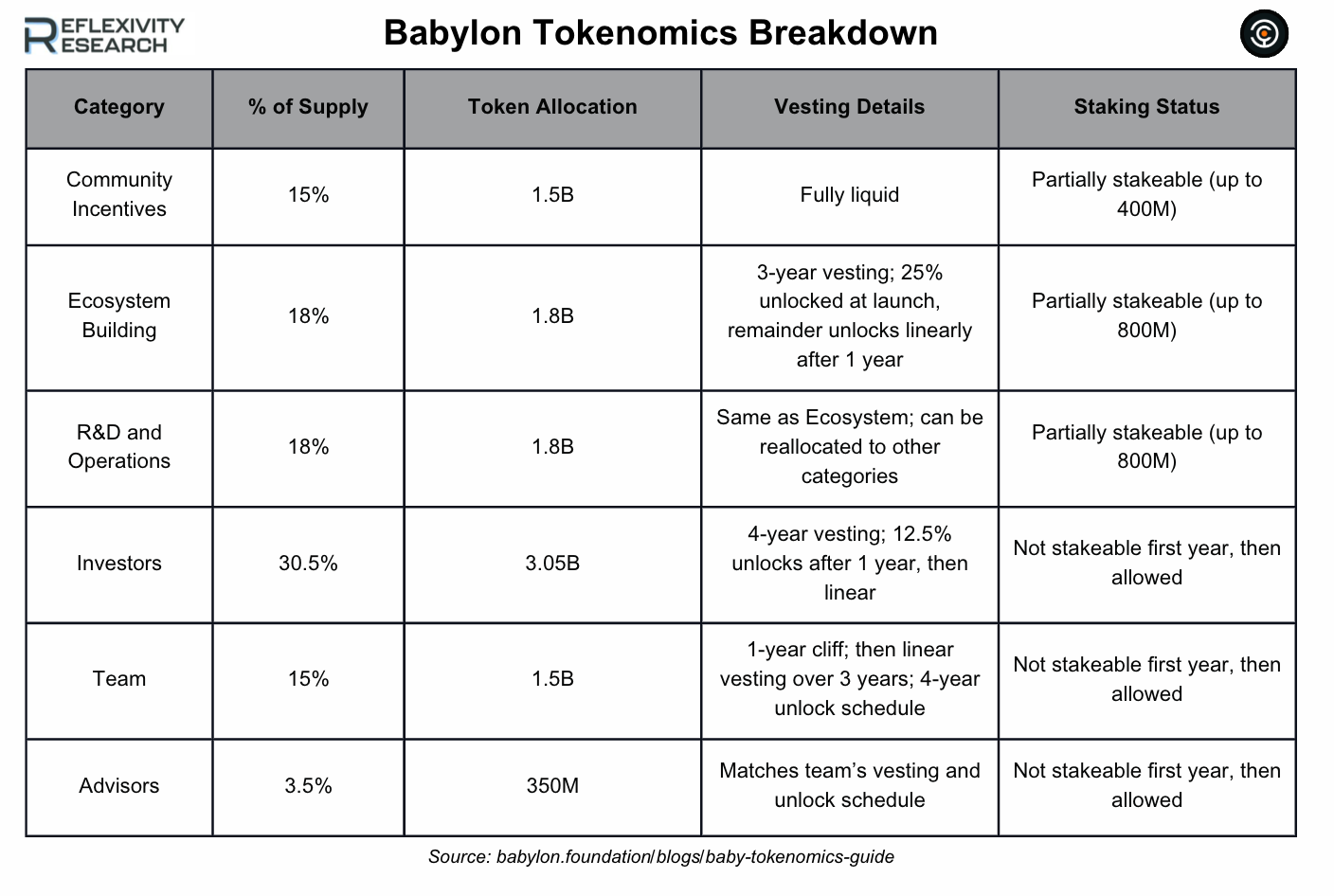 The native token, $BABY, underpins the Babylon ecosystem. It functions as gas for transactions, empowers governance, and anchors a dual staking mechanism involving both BABY and BTC. This structure rewards stakers and ensures robust, decentralized security.