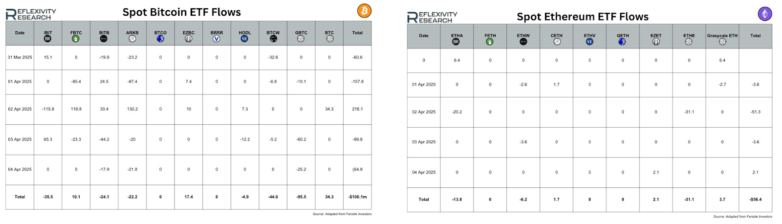 Bitcoin ETFs saw net redemptions of just over $100M for the week despite a big $218M mid-week inflow (Apr 2), mainly into ARKB and FBTC. Outflows resumed sharply on Thursday and Friday, led by GBTC and BITB.