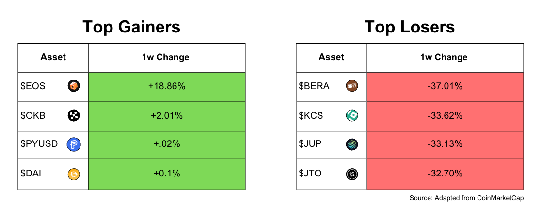 $EOS was the top performer of the last week following a major rebranding initiative, transitioning to 'Vaulta' with a focus on blockchain-powered banking solutions. This strategic shift aims to enhance real-world applicability and has generated substantial investor interest.