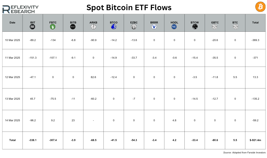 Over the five trading days from 10th to 14th March 2025, spot Bitcoin ETFs experienced significant net outflows totaling $921.4 million, reflecting continued investor withdrawals. The largest single-day outflow occurred on 11th March, with $371 million exiting various ETFs, led by $151.3 million from IBIT and $107.1 million from FBTC. IBIT and FBTC recorded the highest cumulative outflows, losing $338.1 million and $307.4 million, respectively, while GBTC also saw substantial redemptions of $80.6 million. ARKB contributed to the losses with $68.5 million in net outflows, while BTCO, EZBC, and BTCW experienced moderate withdrawals.