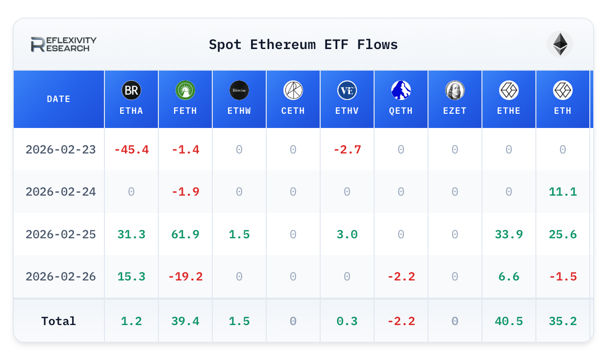 ETH spot ETFs: Net inflows were +$116M, but they were highly concentrated on Feb 25. The week opened with -$49.5M on Feb 23, turned slightly positive on Feb 24 (+$9M), surged on Feb 25 (+$157M), then finished essentially flat on Feb 26 (-$1M). Flows were led by ETHE (+$40.5M), FETH (+$39.4M), and ETH (+$35.2M), while ETHA was roughly flat at +$1.2M.