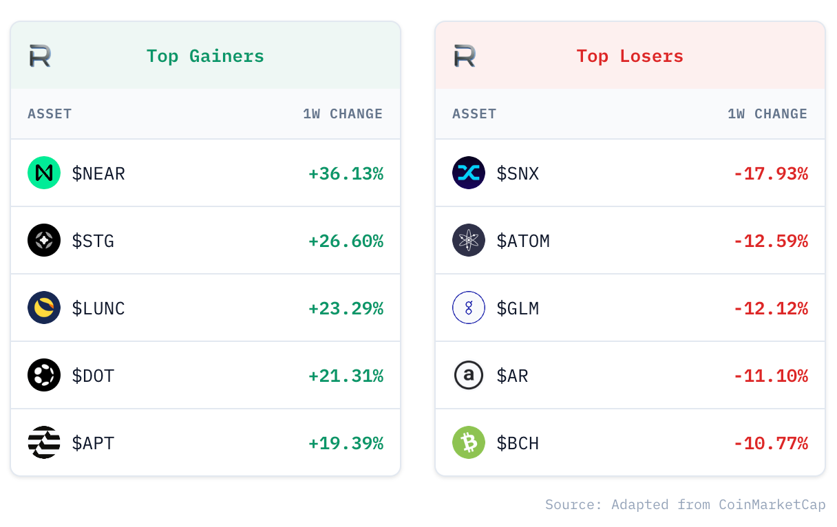 Altcoin performance this week was led by NEAR, which surged +36% after the protocol unveiled near.com, a new AI-powered crypto super-app designed to unify cross-chain activity, enable confidential transactions, and allow AI agents to execute on-chain actions.