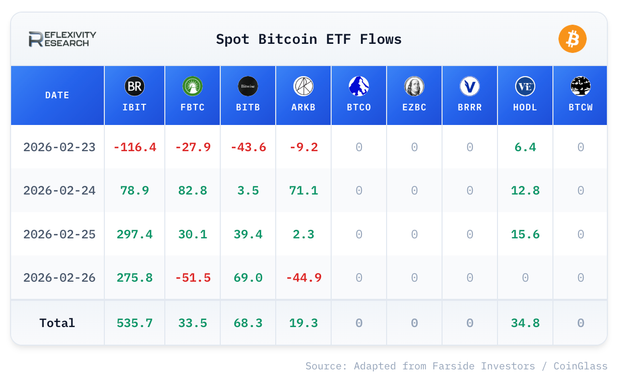 BTC spot ETFs: Net inflows totaled +$692M across the four sessions, driven by a sharp reversal after a weak start. Feb 23 saw the only outflow day at about -$191M, then flows flipped positive on Feb 24 (+$249M) and accelerated on Feb 25 (+$385M) and Feb 26 (+$248M). IBIT dominated the week with +$536M, with smaller support from BITB (+$68M), HODL (+$35M), FBTC (+$34M), and ARKB (+$19M).