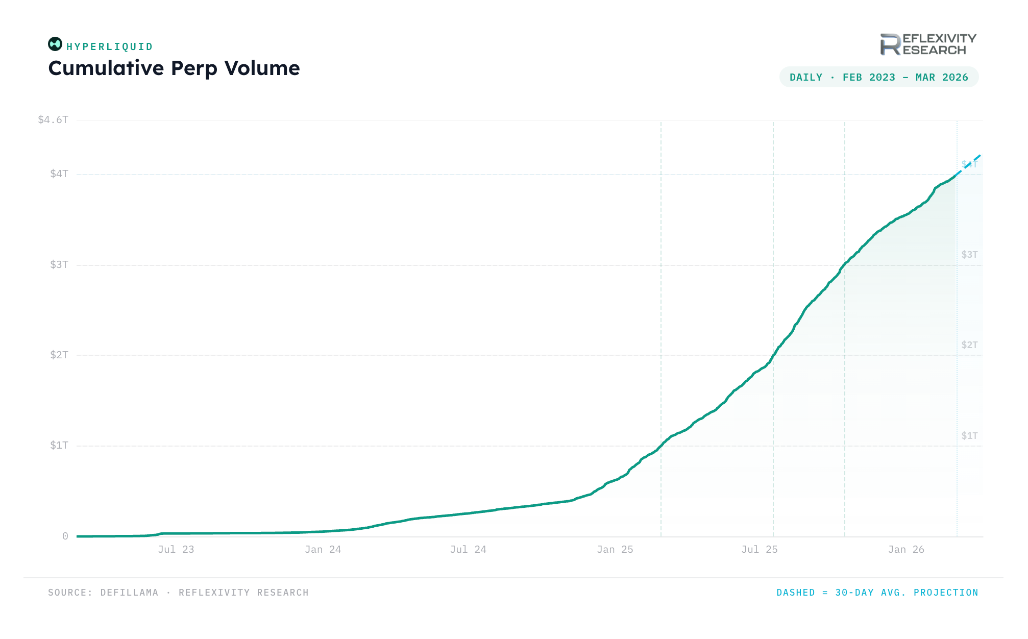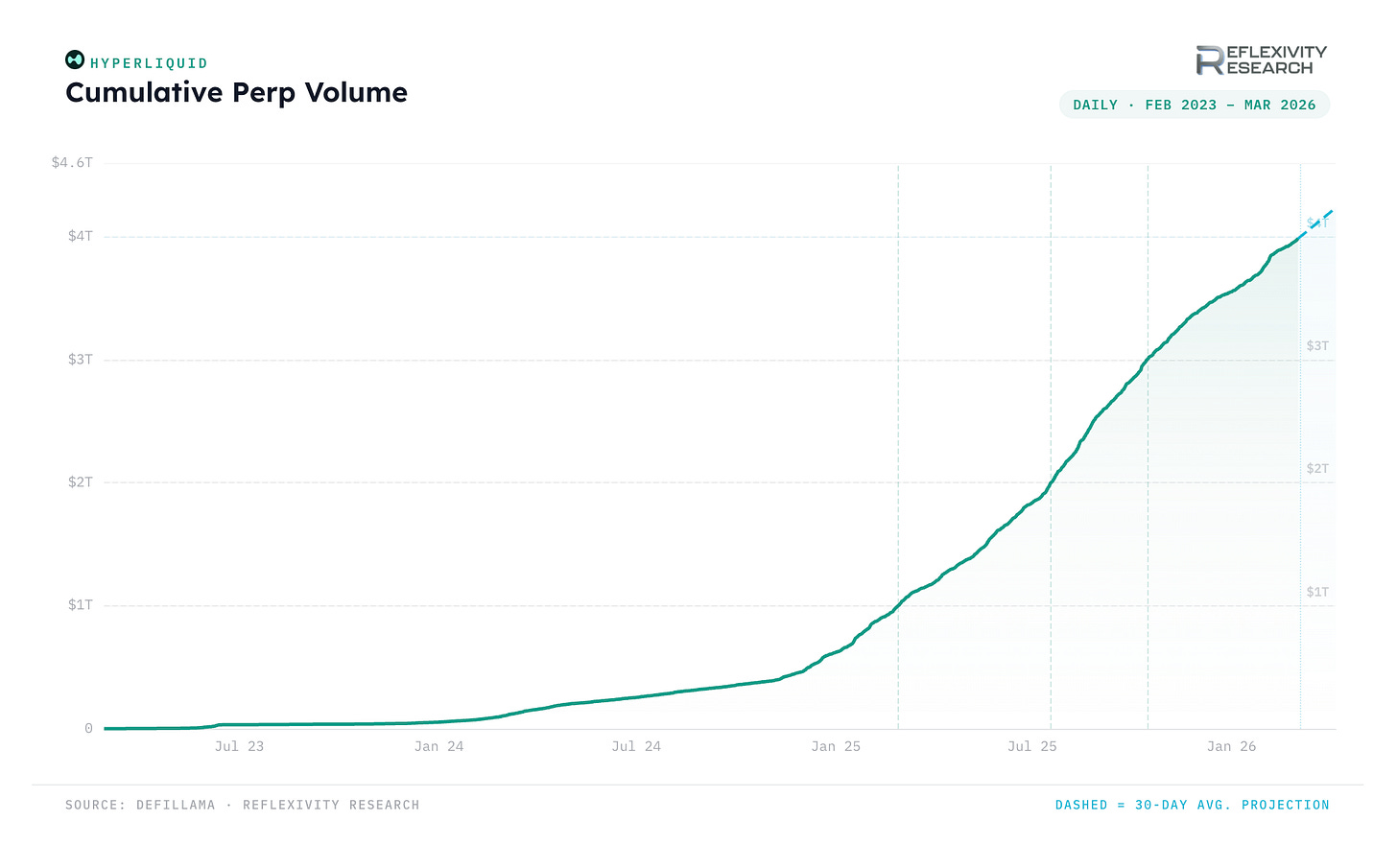 Hyperliquid’s cumulative perpetual futures volume has reached ~$4 trillion, roughly three years after launch. The pace of growth has been nonlinear. The first $1T took 733 days, the second just 141 days, the third only 88 days, and the fourth ~141 days.