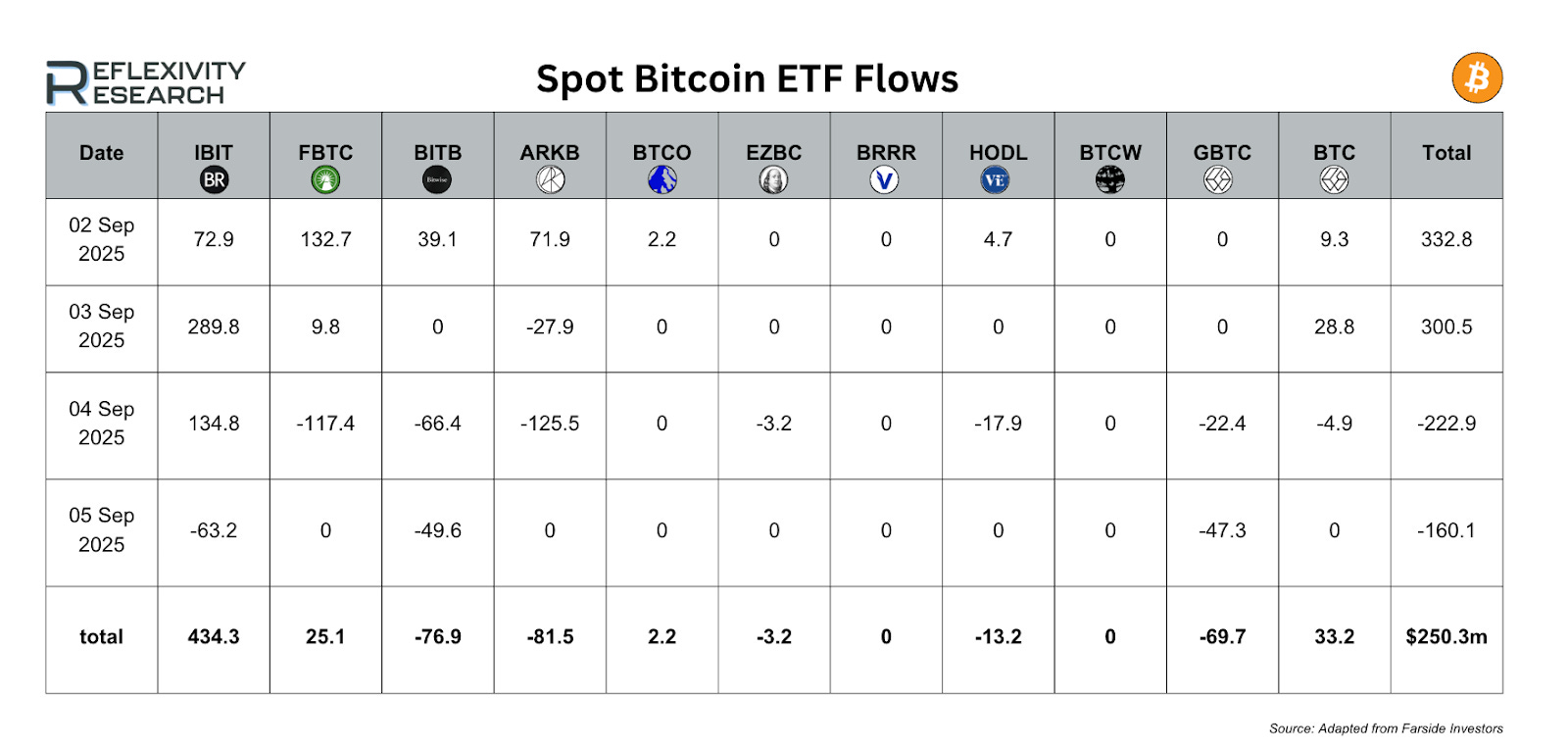 Net +250.3. Strong creations on 2 Sep (+332.8) and 3 Sep (+300.5) more than offset 4 Sep (-222.9) and 5 Sep (-160.1). By issuer: IBIT +434.3, FBTC +25.1, BTC +33.2, BTCO +2.2. Offsets came from BITB -76.9, ARKB -81.5, GBTC -69.7, HODL -13.2, EZBC -3.2. The upshot is a modest weekly gain led almost entirely by IBIT while legacy GBTC and several peers saw outflows.