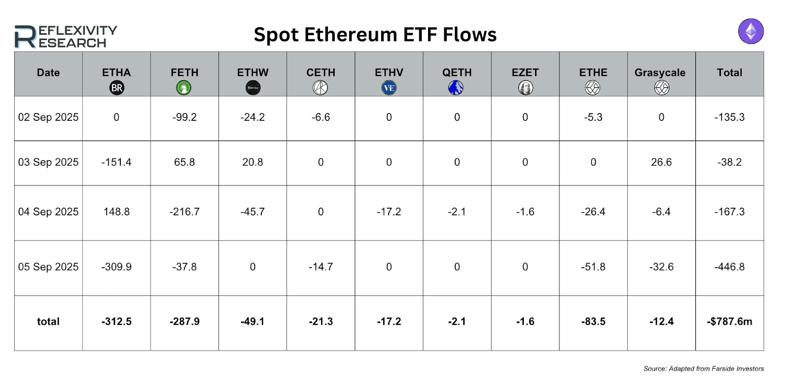 Net -787.6 with the damage concentrated on 5 Sep (-446.8) and additional red days on 2 Sep (-135.3) and 4 Sep (-167.3); 3 Sep was only slightly negative (-38.2). Biggest drags: ETHA -312.5, FETH -287.9, ETHE -83.5. Smaller products were also soft: ETHW -49.1, CETH -21.3, ETHV -17.2, QETH -2.1, EZET -1.6; Grayscale ETH was mixed and finished -12.4 despite a one-day +26.6 inflow on 3 Sep.