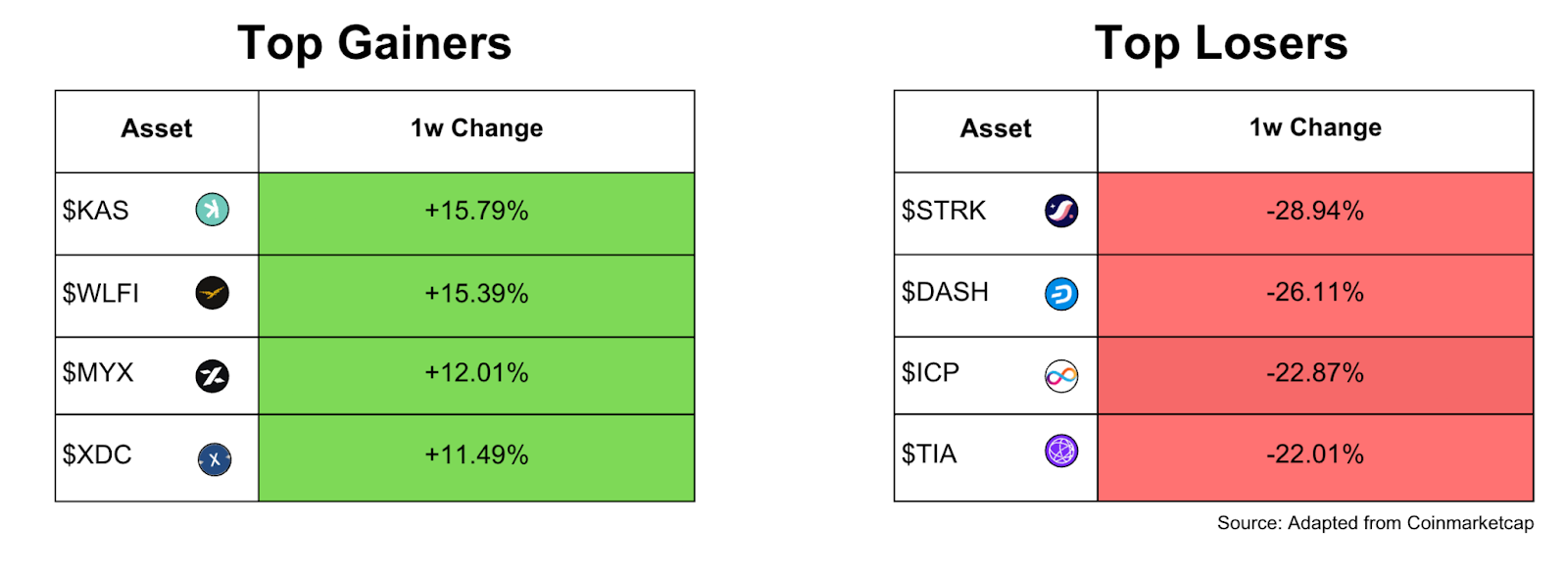 Last week, $KAS was the top gainer. This was largely attributed to Kaspa’s new programmability/smart-contract roadmap and throughput narrative, giving traders a fresh bullish story.