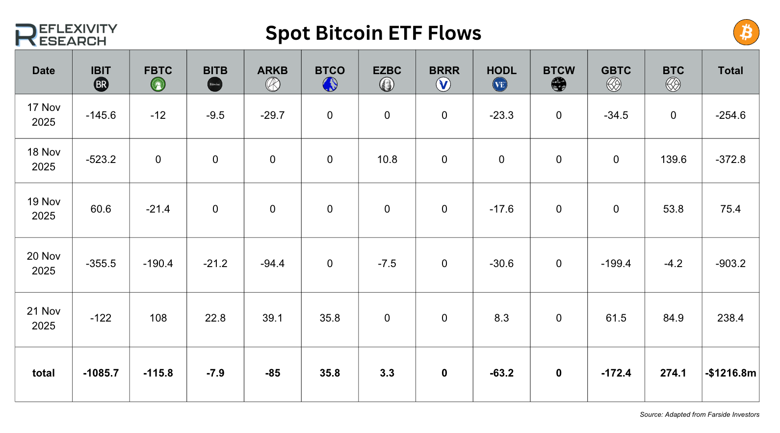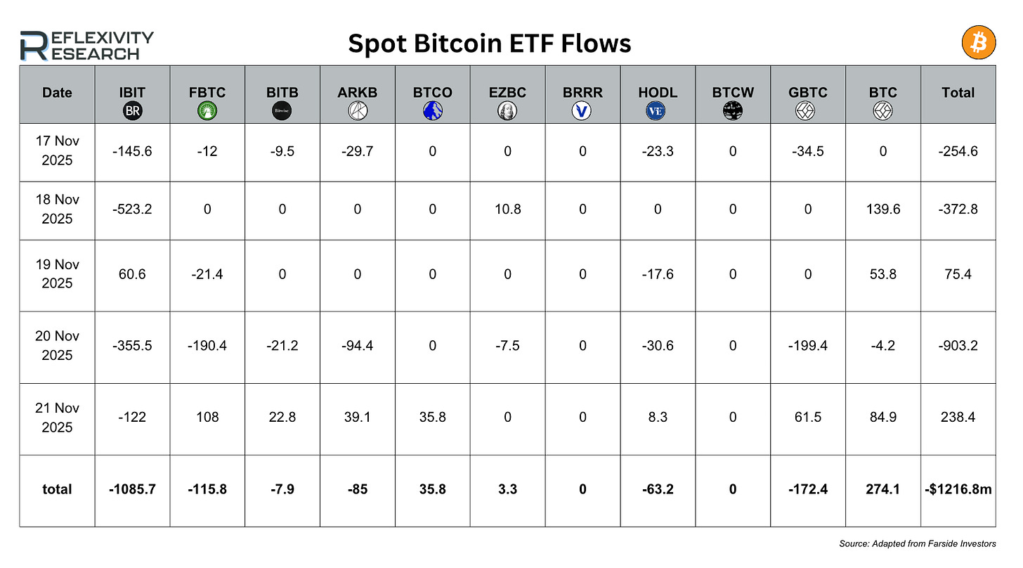 Bitcoin ETFs (17–21 Nov 2025, $ millions): Net -1,216.8. The complex saw three heavy sell days (Mon -254.6, Tue -372.8, Thu -903.2) partially offset by Wed +75.4 and Fri +238.4. Outflows were led by IBIT -1,085.7, with additional redemptions from GBTC -172.4, FBTC -115.8, ARKB -85.0, HODL -63.2, and BITB -7.9. Small creations in BTC (+274.1), BTCO (+35.8) and EZBC (+3.3) weren’t enough to change the tone.