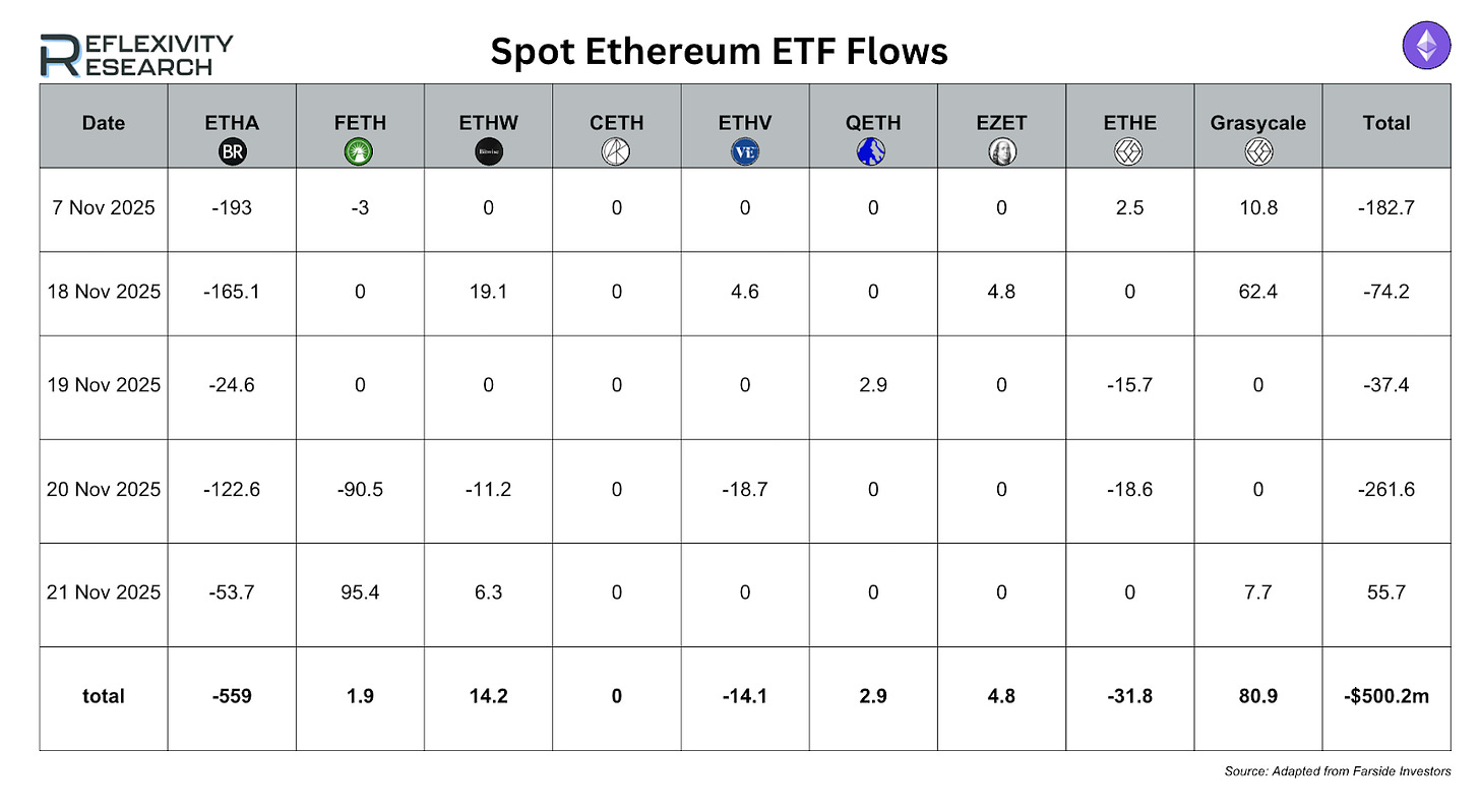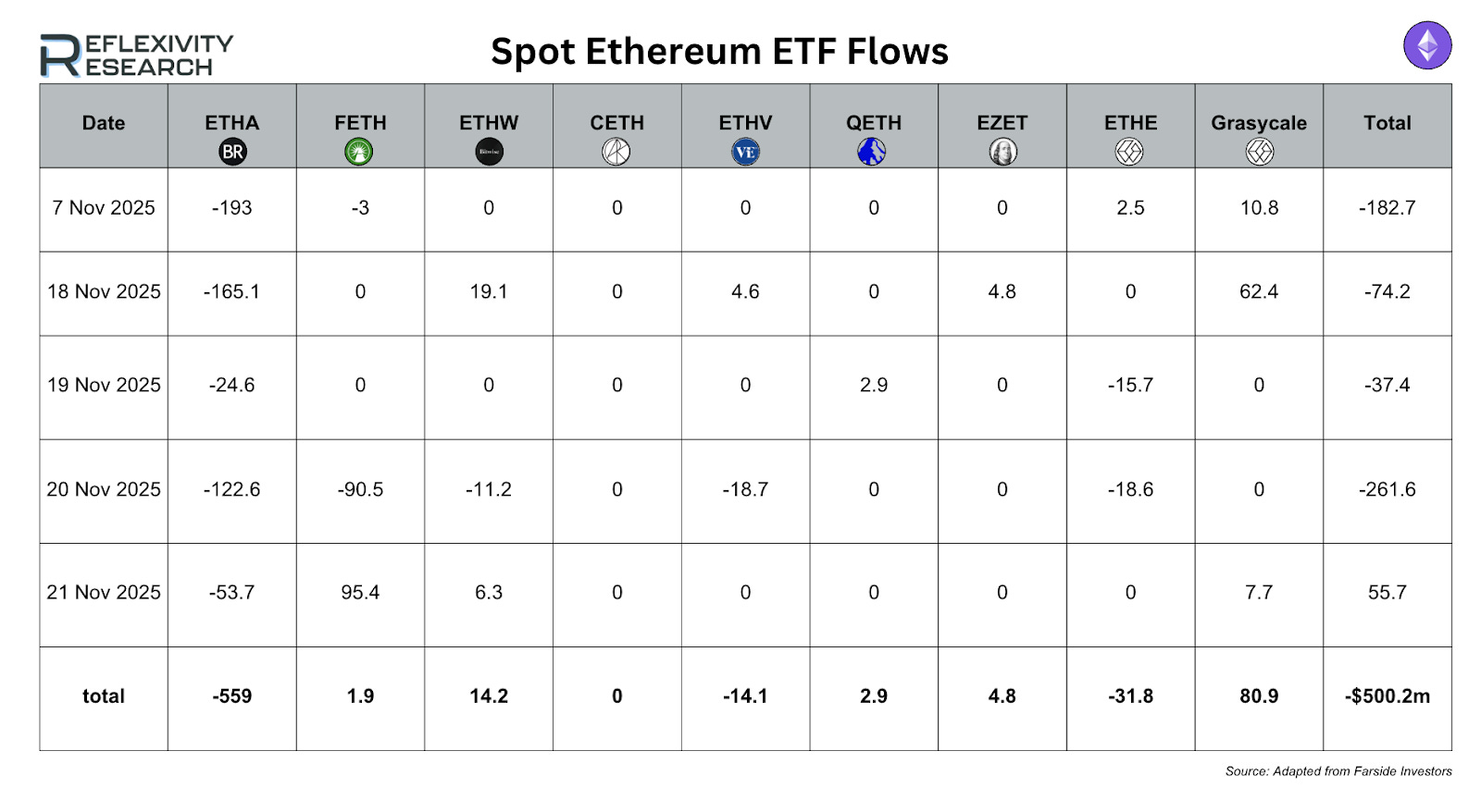 Ethereum ETFs (7, 18–21 Nov 2025, $ millions): Net -500.2. Flows were negative on four of five sessions (-182.7, -74.2, -37.4, -261.6) before a modest +55.7 finish. Selling was driven by ETHA -559.0, ETHE -31.8, and to a lesser extent ETHV -14.1; offsets were limited to Grayscale ETH +80.9, ETHW +14.2, QETH +2.9, and EZET +4.8.