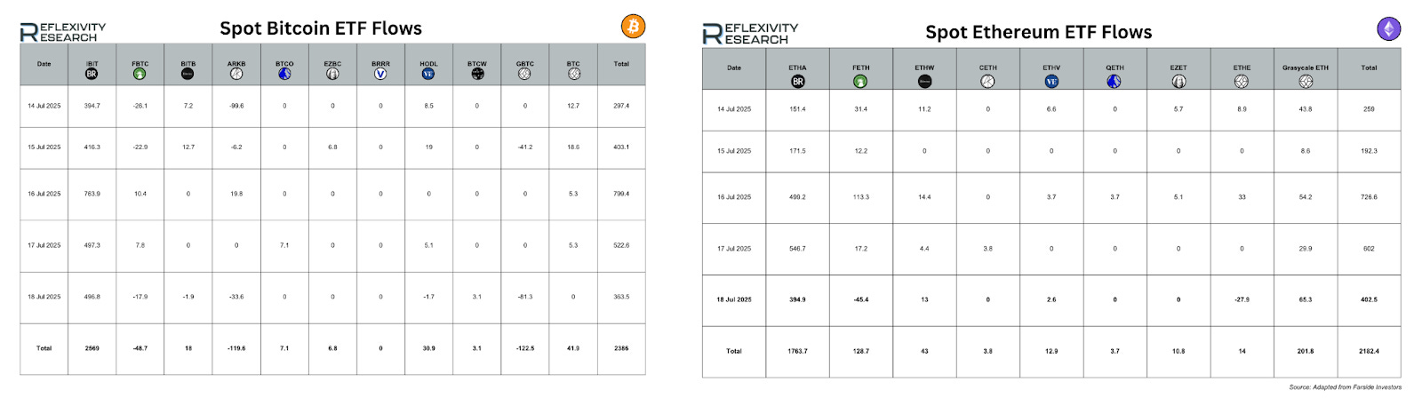 Bitcoin ETFs (14 – 18 Jul): Net + $2.4 bn. BlackRock’s IBIT supplied almost the lot (+ $2.6 bn), led by big creations on 16 Jul ($764 m) and 17 Jul ($497 m). Modest help came from HODL and BTC (+ $72 m combined), while FBTC, ARKB and GBTC together drained about – $290 m.