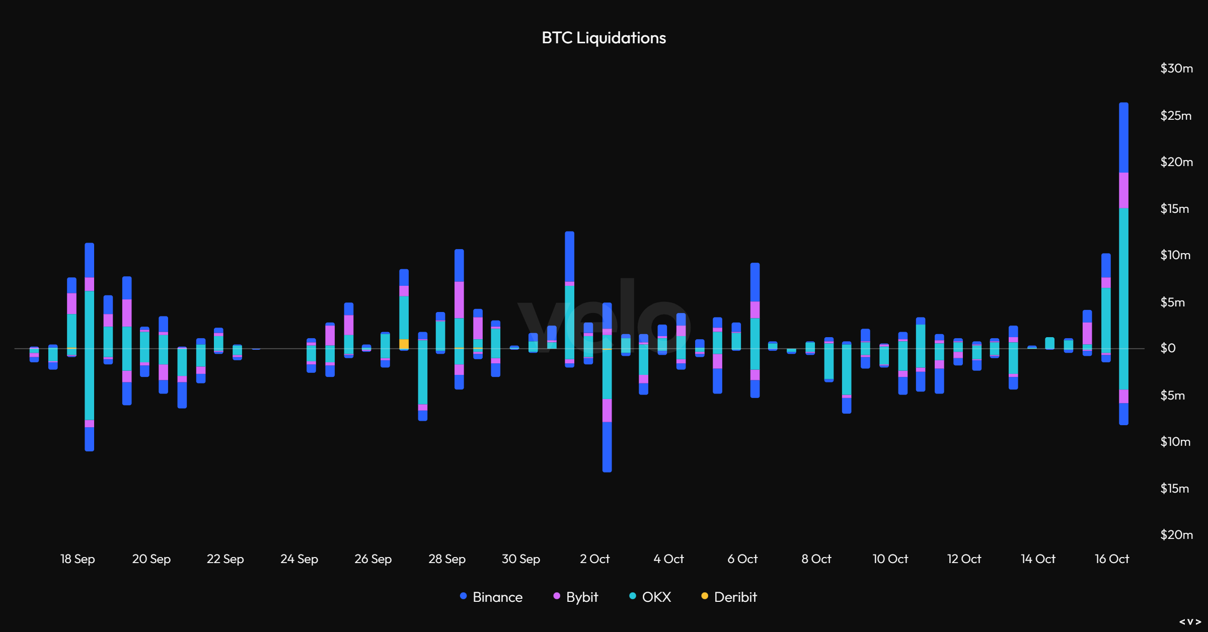 On the morning of Monday 10/16 the market rallied up over 7% within minutes after a false headline from crypto news outlet Cointelegraph. Shortly after, the headline was disputed by Fox Business journalist Eleanor Terrett, providing a statement from Blackrock confirming that their Bitcoin ETF application is still under review. Shortly after, the false headline was confirmed once again by the SEC. This event triggered over $100 million in liquidations of futures positions in the 45 minutes following, meaning traders were forced to close positions on both the long and short side.