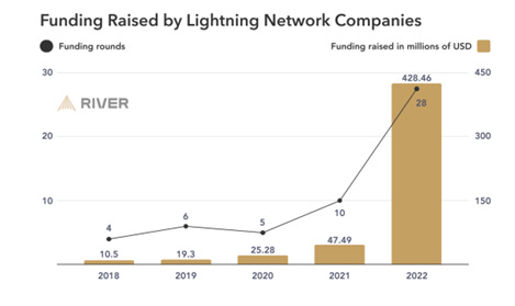 Another interesting chart from the report was published around the amount of investment that has been poured into lightning network companies, which reached $428 million in 2022, up nearly 10x from the year prior.