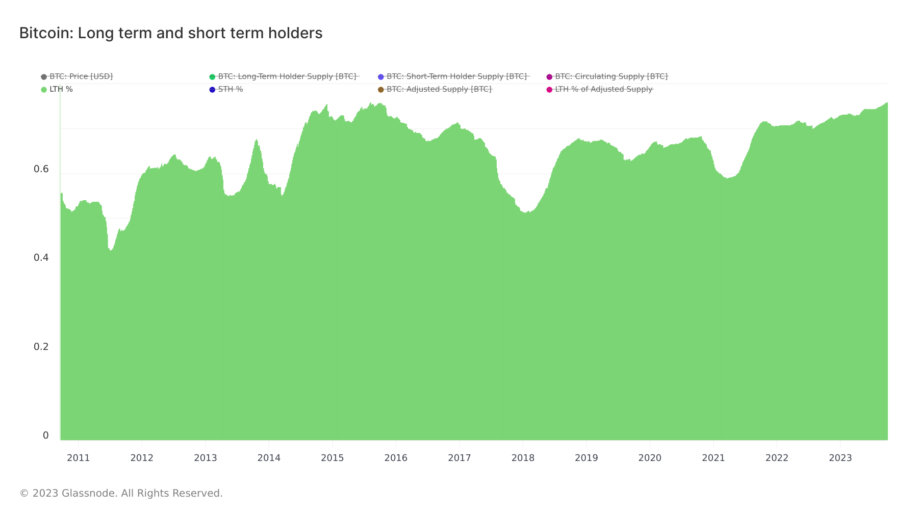 Percentage of Bitcoin supply held by long term holder officially reaches all time highs
